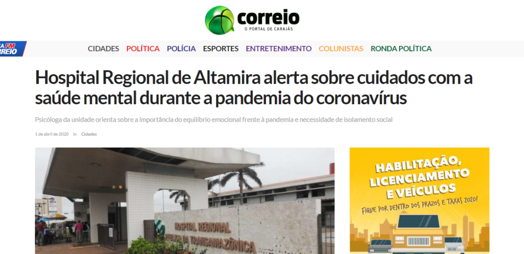 Correio de Carajás – Hospital Regional da Transamazônica alerta sobre cuidados com a saúde mental durante a pandemia do coronavírus