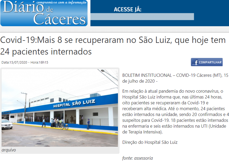 Diário de Cáceres – Oito pacientes se recuperam da covid-19 no Hospital São Luiz