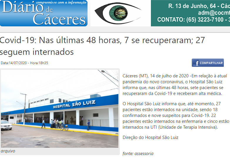 Diário de Cáceres – Sete pacientes se recuperam da Covid-19 no Hospital São Luiz