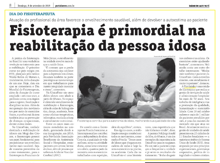 Diário do Alto Tietê – Profissional da UnicaFisio explica que fisioterapia é primordial na reabilitação da pessoa idosa
