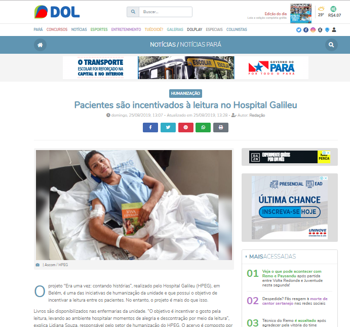 Diário do Pará – Hospital Galileu incentiva a leitura aos pacientes com o projeto “Era uma vez: contando histórias”