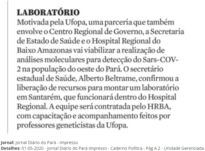 Diário do Pará – Hospital Regional do Baixo Amazonas firma parceria para realizar testes da covid-19 em novo laboratório