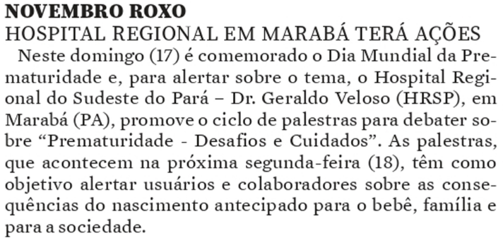 Diário do Pará – Hospital Regional do Sudeste do Pará promove palestras sobre prematuridade no Novembro Roxo