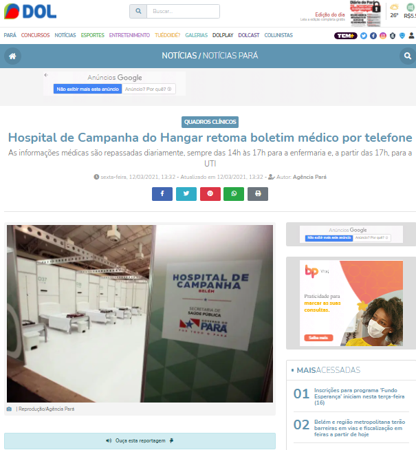 Diário do Pará Online – Com agravamento da pandemia, Hospital de Campanha do Hangar retoma boletim médico por telefone