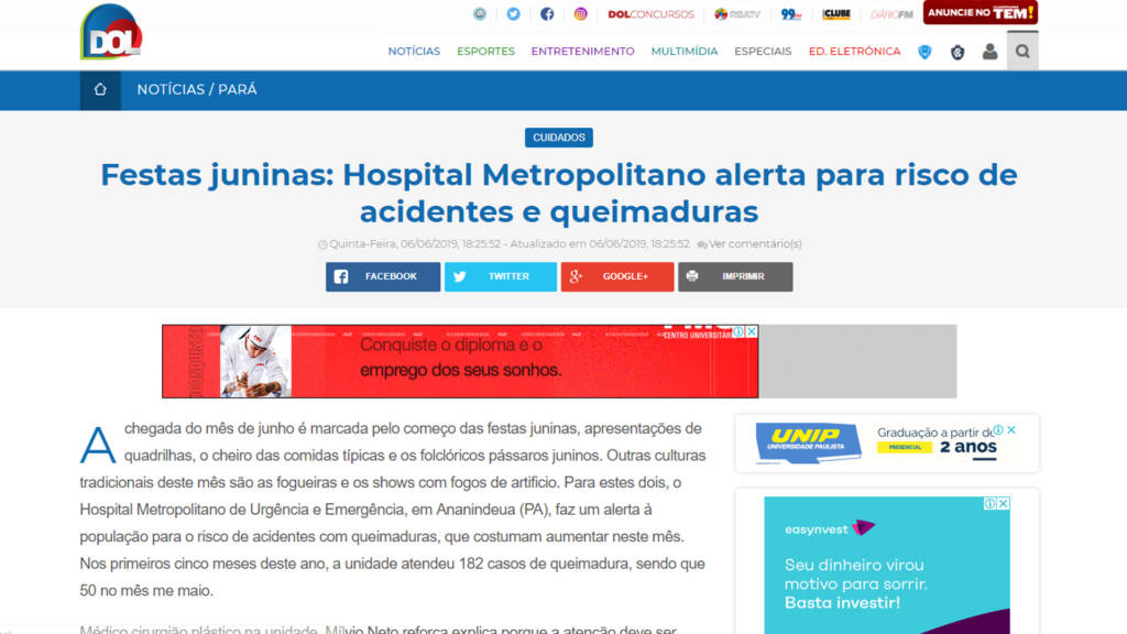 Diário Online – Festas juninas: Hospital Metropolitano alerta para risco de acidentes e queimaduras