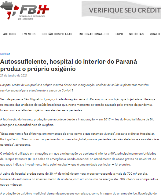 Federação Brasileira de Hospitais – Autossuficiente, Hospital Madre de Dio produz o próprio oxigênio
