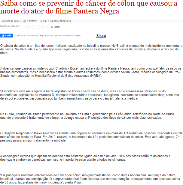 Folha de Óbidos – Hospital Regional do Baixo Amazonas orienta para a prevenção de doença que causou a morte do ator do filme Pantera Negra