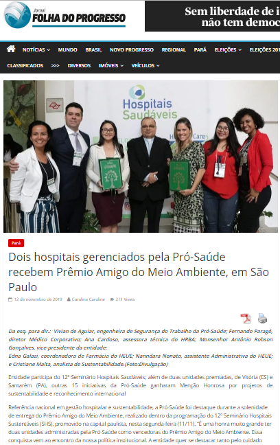 Folha do Progresso – Dois Hospitais gerenciados pela Pró-Saúde recebem prêmio Amigo do Meio Ambiente, em São Paulo