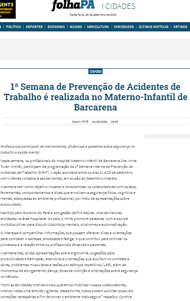 Folha PA – 1ª Semana de Prevenção de Acidentes de Trabalho é realizada no Hospital Materno-Infantil