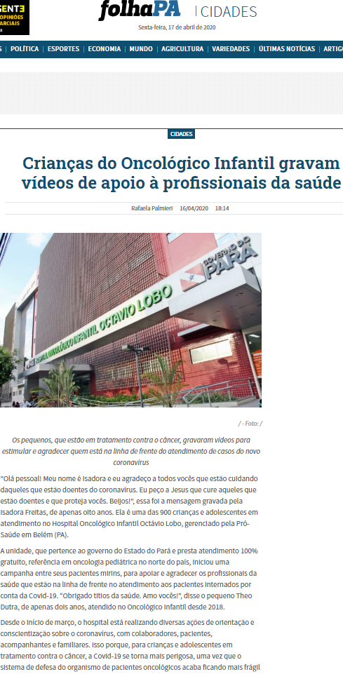 Folha PA – Crianças do Hospital Oncológico Infantil gravam vídeos de apoio à profissionais de saúde