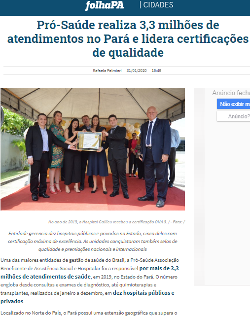 Folha PA – Em 2019, a Pró-Saúde realizou 3,3 milhões de atendimentos no Pará e liderou certificações de qualidade