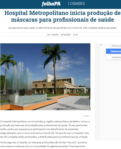 Folha PA – Hospital Metropolitano inicia produção de máscaras para profissionais de saúde