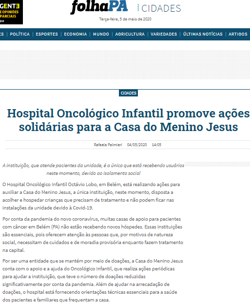 Folha PA – Hospital Oncológico Infantil promove ações solidárias para a Casa do Menino Jesus
