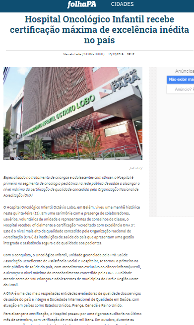 Folha PA – Hospital Oncológico Infantil recebe certificação máxima de excelência inédita no país