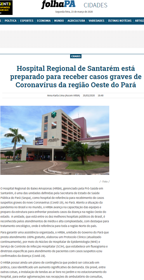 Folha PA – Hospital Regional do Baixo Amazonas está preparado para receber casos graves de Coronavírus