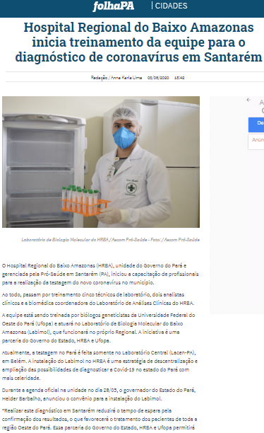 Folha PA – Hospital Regional do Baixo Amazonas inicia treinamento da equipe que irá atuar em novo laboratório