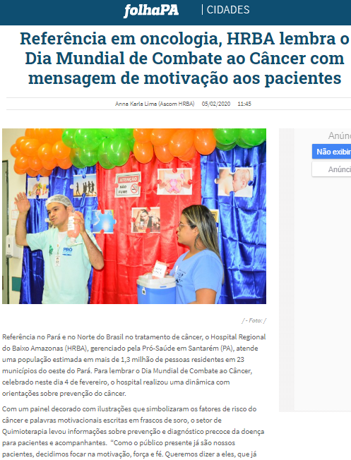 Folha PA – Hospital Regional do Baixo Amazonas lembra Dia Mundial de Combate ao Câncer com mensagem de motivação aos pacientes