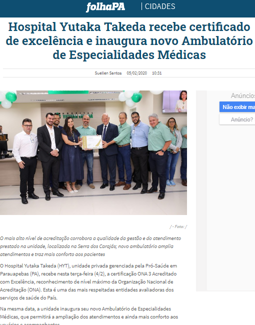 Folha PA – Hospital Yutaka Takeda recebe certificado de excelência e inaugura novo Ambulatório de Especialidades Médicas