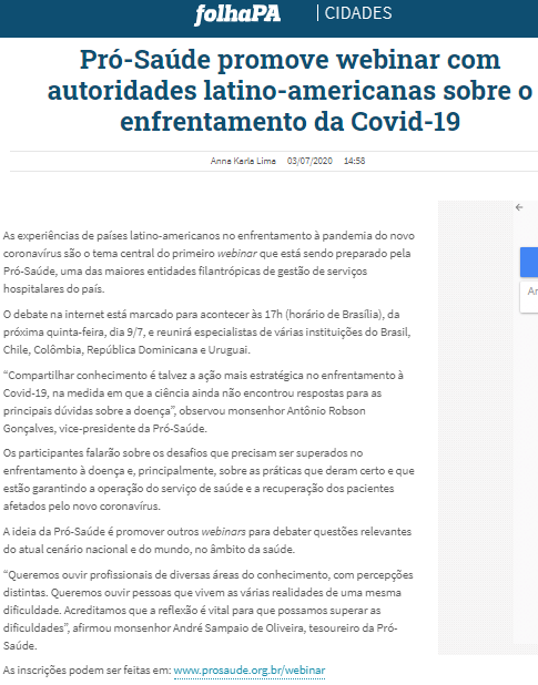 Folha PA – Pró-Saúde promove webinar com autoridades latino-americanas sobre o enfrentamento da Covid-19