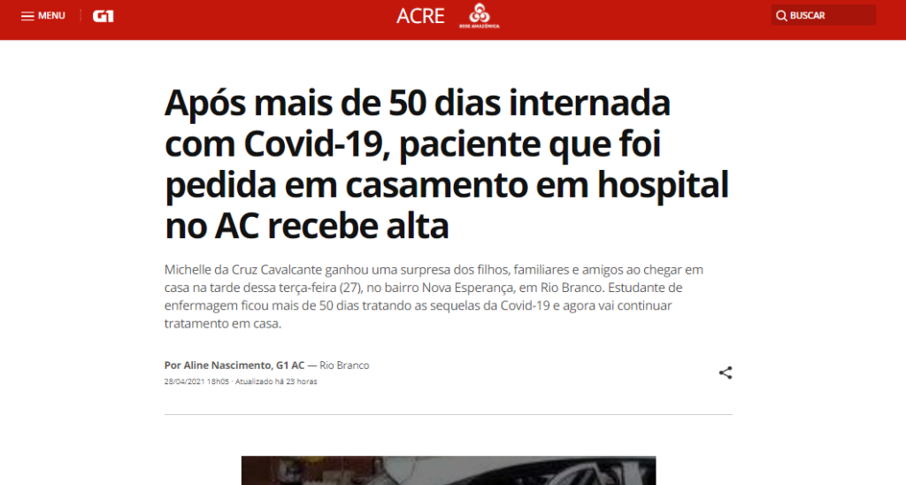 G1 Acre – Após mais de 50 dias internada com Covid-19, paciente que foi pedida em casamento no Hospital Santa Juliana recebe alta