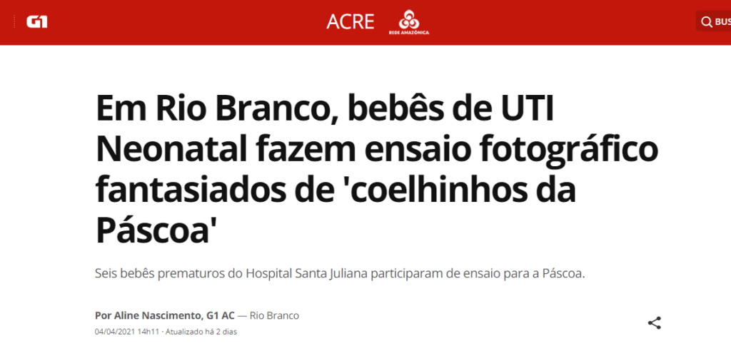 G1 Acre – Bebês de UTI Neonatal fazem ensaio fotográfico fantasiados de ‘Coelhinhos da Páscoa’ no Hospital Santa Juliana
