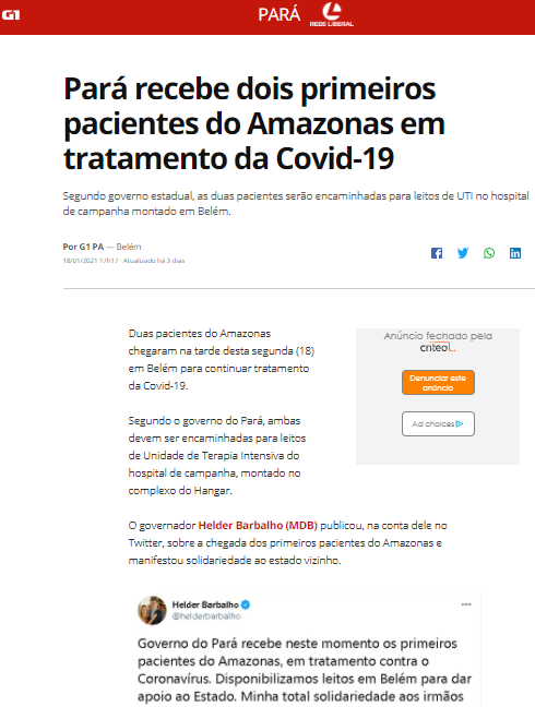 G1 Pará – Hospital de Campanha do Hangar recebe dois primeiros pacientes do Amazonas para tratamento da Covid-19 no Estado