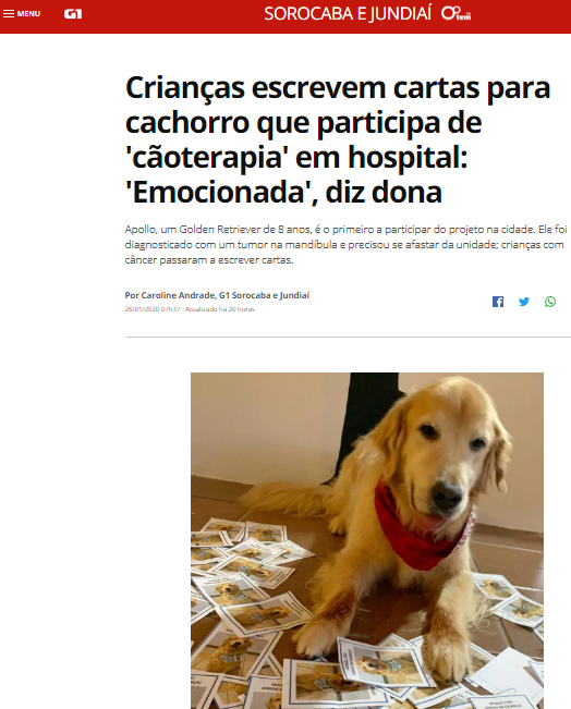 G1 Sorocaba e Jundiaí – Cão voluntário em recuperação recebe cartas das crianças do Hospital Universitário