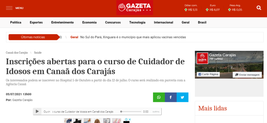Gazeta Carajás – Inscrições abertas para o curso de cuidador de idosos em Canaã dos Carajás