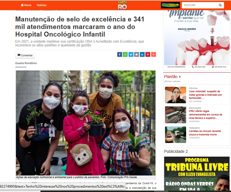 Gazeta Rondônia – Manutenção de selo de excelência e 341 mil atendimentos marcaram o ano do Hospital Oncológico Infantil