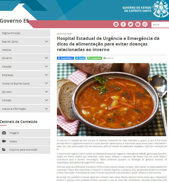 Governo do Estado do Espírito Santo – Hospital Estadual de Urgência e Emergência dá dicas de alimentação para evitar doenças relacionadas ao inverno