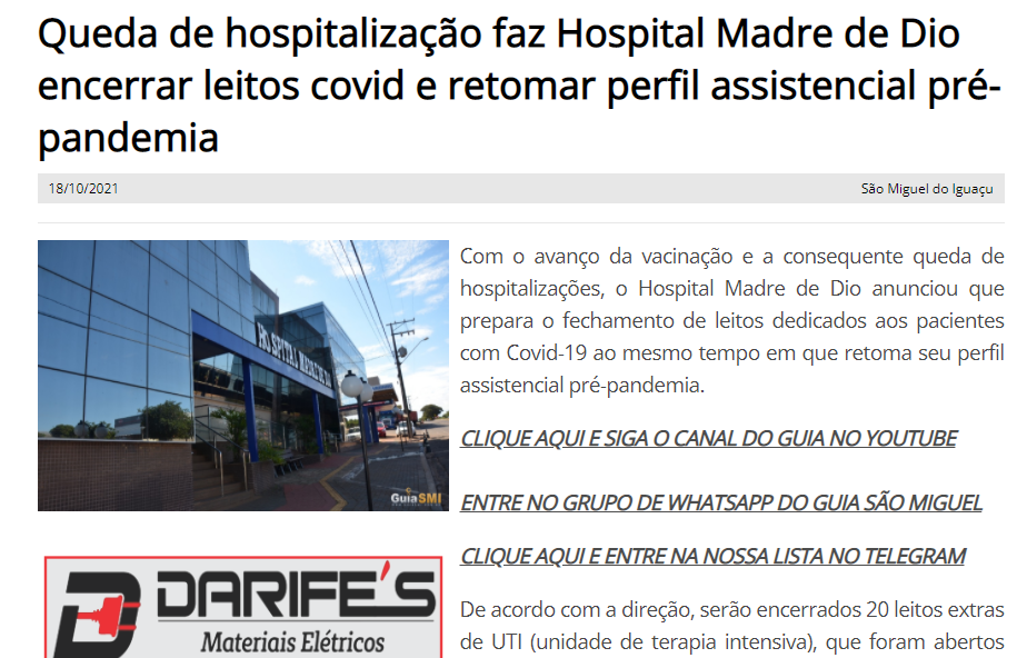 Guia Sim – Queda de hospitalização faz Hospital Madre de Dio encerrar leitos covid e retomar perfil assistencial pré-pandemia