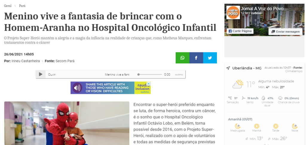 Jornal A Voz do Povo – Menino vive a fantasia de brincar com o Homem-Aranha no Hospital Oncológico Infantil