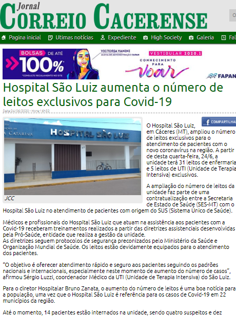 Jornal Correio Cacerense – Hospital São Luiz aumenta o número de leitos exclusivos para Covid-19