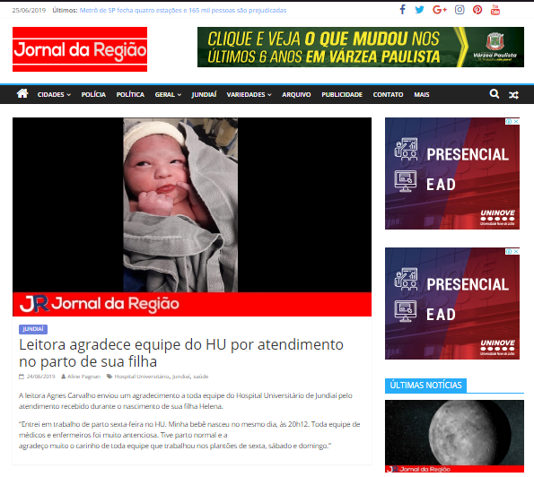 Jornal da Região – Leitora agradece equipe do HU por atendimento no parto de sua filha