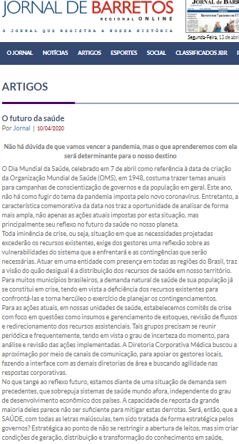 Jornal de Barretos – Dia Mundial da Saúde: diretor médico da Pró-Saúde analisa o legado que a pandemia da do coronavírus deixará nos hospitais