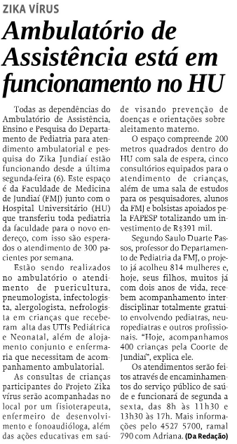 Jornal de Jundiaí – Hospital Universitário inaugura ambulatório para projeto de combate ao Zika vírus