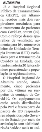 Jornal Diário do Pará – Hospital Regional da Transamazônica recebe dois novos respiradores para tratamento da Covid-19