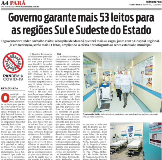 Jornal Diário do Pará – Hospital Regional do Sudeste do Pará terá mais 20 leitos de UTI para atendimento exclusivo da Covid-19