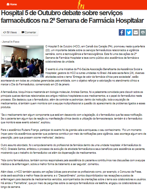 Jornal in Foco – Hospital 5 de Outubro debate sobre serviços farmacêuticos na 2ª Semana de Farmácia Hospitalar
