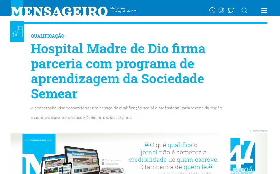 Jornal Mensageiro – Hospital Madre de Dio firma parceria com programa de aprendizagem da sociedade semear