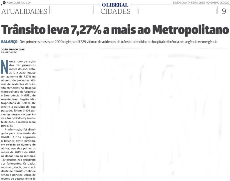 Jornal O Liberal – Hospital Metropolitano divulga aumento de 7,27% nos acidentes de trânsito em 2020