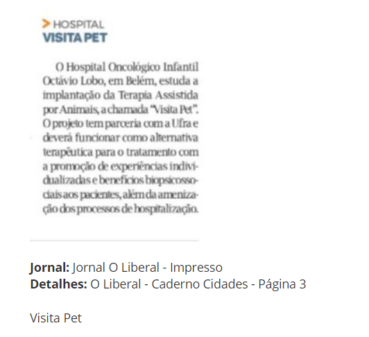 Jornal O liberal – Hospital Oncológico Infantil estuda a possibilidade de terapia assistida chamada “Visita Pet”