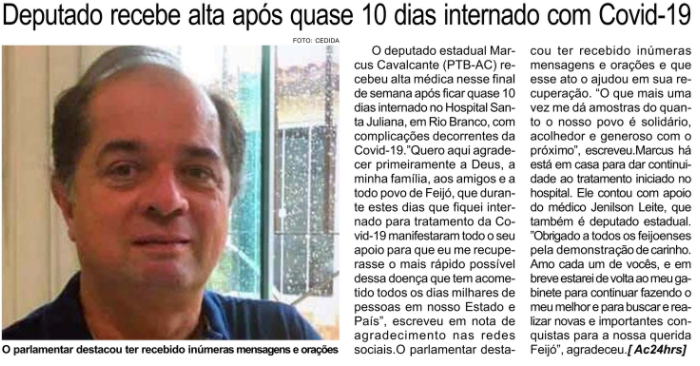 Jornal O Rio Branco – Deputado recebe alta após quase 10 dias internado por Covid-19 no Hospital Santa Juliana