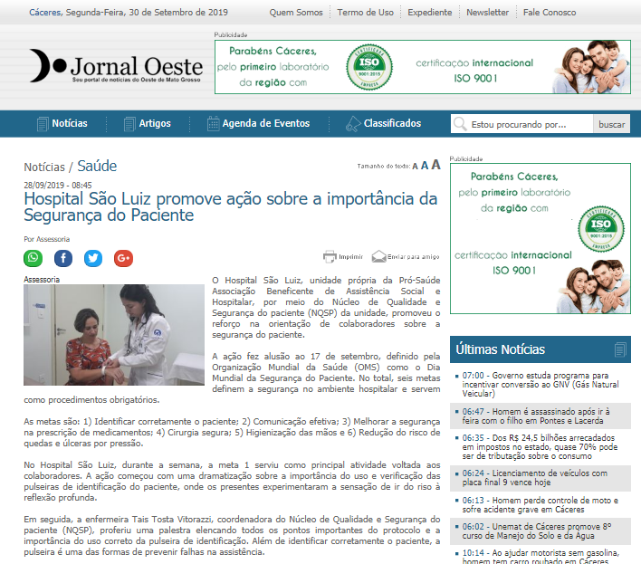Jornal Oeste – Hospital São Luiz promove ação sobre Segurança do Paciente