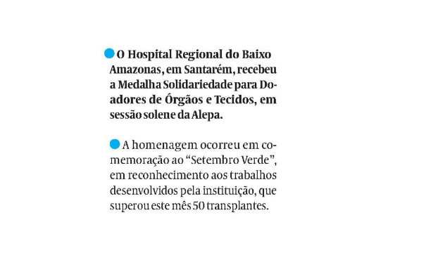 O Liberal – Hospital Regional do Baixo Amazonas recebeu a Medalha Solidariedade para doadores de órgãos e tecidos