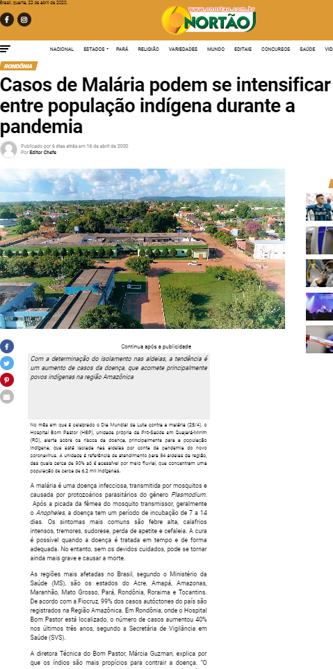 O Nortão – Hospital Bom Pastor alerta sobre possível aumento de casos malária entre população indígena durante a pandemia