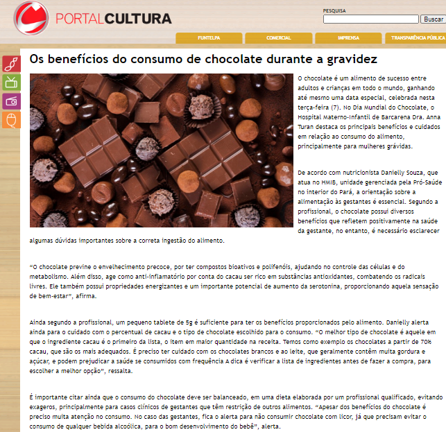 Portal Cultura – Nutricionista do Hospital Materno-Infantil aponta os benefícios do chocolate para a gravidez