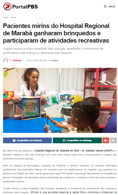Portal PBS – Pacientes mirins do Hospital Regional de Marabá ganham brinquedos e participam de oficinas artísticas
