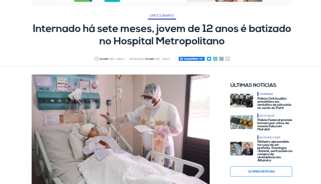 Portal Roma News – Internado há sete meses, jovem de 12 anos é batizado no Hospital Metropolitano