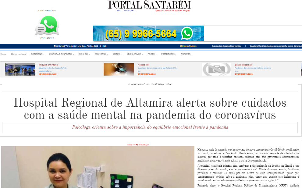 Portal Santarém – Hospital Regional da Transamazônica alerta sobre cuidados com a saúde mental na pandemia do coronavírus